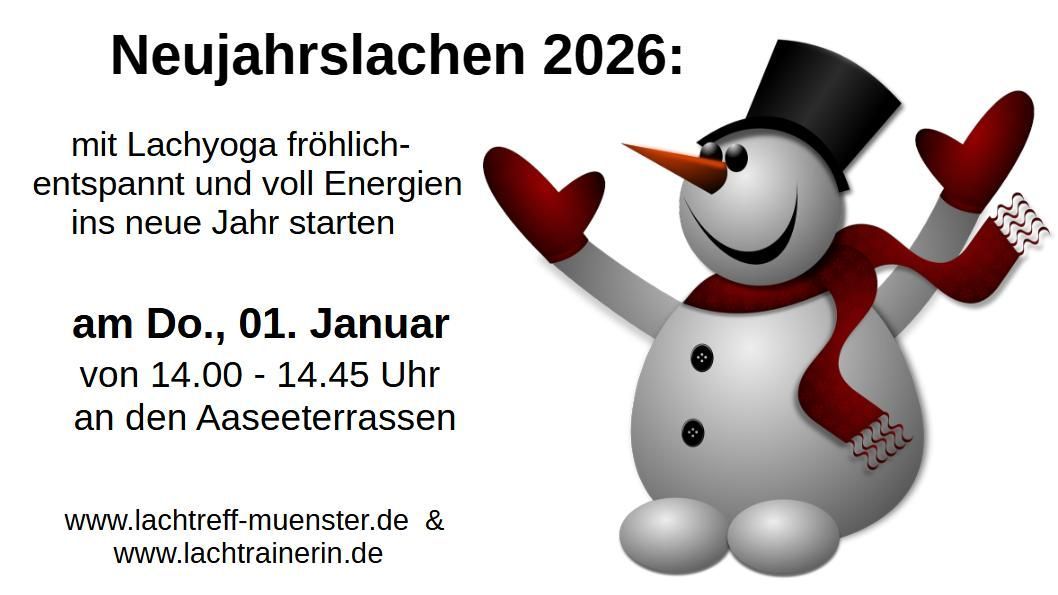 Herzliche Einladung an alle lachfreudigen Menschen und Interessierten beim diesjährigen Neujahrslachen für Gesundheit, Glück und (inneren und äußeren) Frieden mitzumachen und mitzulachen. Ab 14.00 Uhr an den Aaseeterrassen.