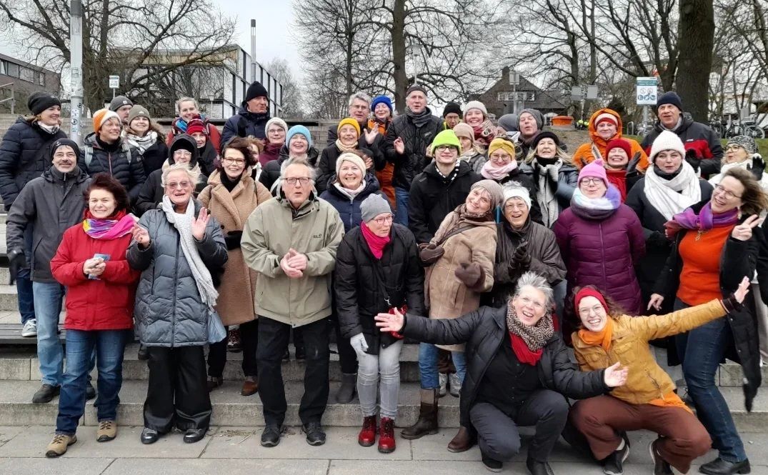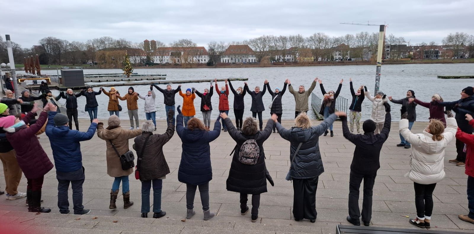 Hier ein Teil der 50 lachfreudligen Menschen, die energievoll und fröhlich mit uns an den Aaseeterrassen ins Jahr 2024 gestartet sind. Angeleitet wurde das Neujahrslachen von Lachyoga-Lehrerin Veronika Spogis (vorne, dritte von rechts) und Lachyoga-Leiter Markus Dittberner (vorne, dritter von links)