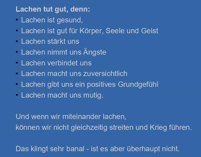 Gerade die positiven Wirkungen eines offenen, zugewandten Lächelns oder Lachens können in diesen Zeiten der bedrückenden und Zuversicht nehmenden Auswirkungen von Klimakrise und Kriegen eine wichtige Unterstützung bieten: Lachen verbindet die Menschen, Lachen ist gesund für Körper, Seele und Geist, Lachen nimmt Ängste, Lachen macht zuversichtlich, Lachen erzeugt ein positives Grundgefühl und Lachen macht mitfühlender und fürsorglicher - und wenn miteinander gelacht wird, kann nicht gleichzeitig gestritten werden. Dies alles sind Ergebnisse der Gelotologie, der Wissenschaft des Lachens.